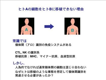 私たちは生物が生まれながらに持っている自分と他人を区別する能力を研究しています。自分を「自己細胞」、他 人を「他細胞」と置き換えると自己・非自己識別能力、即ち免疫になります。免疫の担当細胞は微生物やがん細胞を 「非自己」と見分けて傷害する能力を持ちます。私たちは“どうやって非自己と見分けるの”という研究をしている わけです(下図)。尤もこんなことが分かろうと分かるまいと免疫細胞は日夜がんや感染を抑えている訳ですが。良 く分からない,と云う方は以下に科学用語で書きますからゆっくりご覧ください。