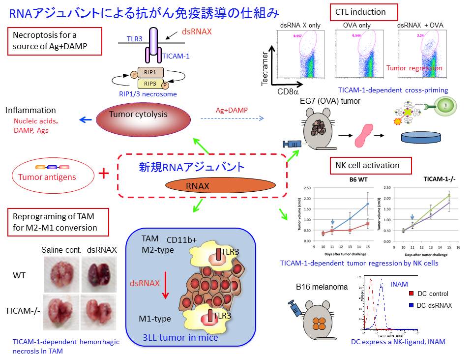 当研究室と大阪府立成人病センターは、共同でがんのアジュバント療法の開発を行なっています。術後の癌患者さんに対してBCG-CWS(ウシ結核菌の細胞壁成分)のアジュバント投与を行ってお り、良好な成績を挙げています。また、BCG-CWSがTLR2/4-MyD88経路を介して樹状細胞を活性化し、キラーT細胞(CTL)を誘導して抗癌作用を発揮することを報告しました。さらに、同じく抗癌作用 を示す合成dsRNAであるpoly I:Cが、TLR3-TICAM1経路を介して樹状細胞を活性化し、新規膜タンパ ク質を介してNK細胞、CTLを誘導し癌を退縮させることを明らかにしています。これらの研究成果は、アジュバント療法に科学的な根拠を与えました。さらに、当研究室では共同研究者と共に、天然物質や化学合成の化合物などから、アジュバントとして有効な物質の探索も継続的に行っています。その中には、人工合成のRNAや藍藻類スピルリナの熱水抽出成分などがあり、既存の治療法と併用することで、相乗的な抗癌効果を発揮することを明らかにしています。