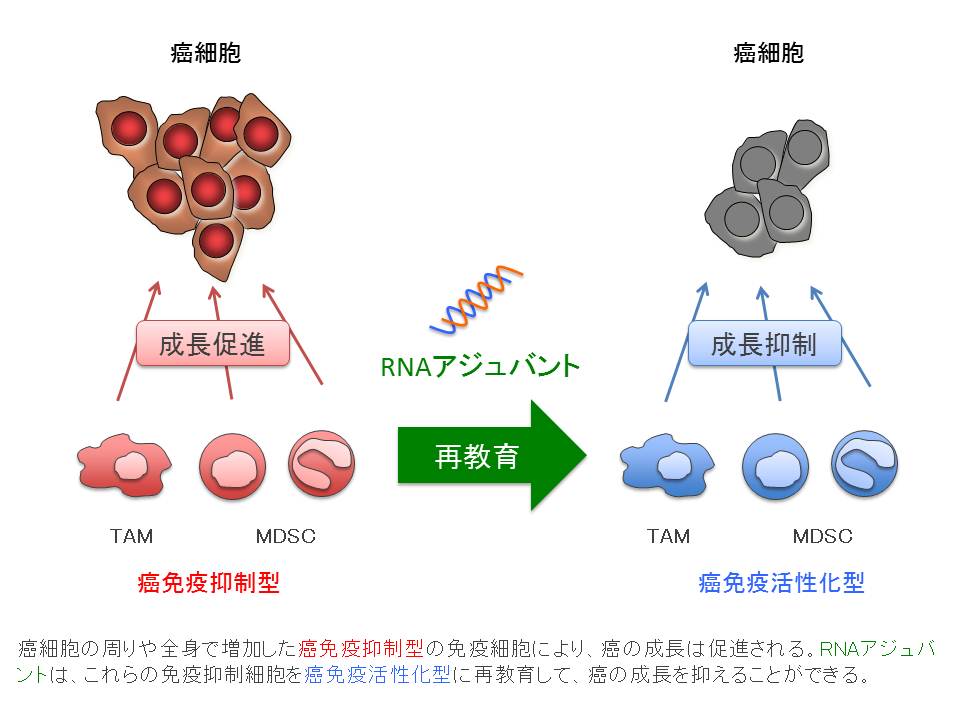 癌になると免疫機能は低下し、癌を排除する免疫機構が有効に働きません。そのため、患者の体内は癌の成長にとって都合の良い環境となります。免疫機能の低下は、癌細胞の塊(腫瘍)に入り込んでいるマクロファージ(TAM)やミエロイド由来サプレッサー細胞(MDSC)、制御性T細胞(Treg)によってもたらされます。これらの細胞は、もともと生体にとって有益な働きをしています。しかし、癌によってその性質を悪用され、結果的に癌の成長を助けているのです。免疫機能の低下は免疫療法による治療の妨げともなるため、これらの細胞を制御できるかどうかは癌治療において重要な問題です。最近我々は、RNAアジュバントがTAMやMDSCに作用し、癌の成長を抑える働きを持った細胞に再教育(re-education)して治療効果を発揮することを動物実験モデルで明らかにしました。RNAアジュバントは、樹状細胞を起点とし細胞傷害性T細胞やNK細胞を活性化して癌細胞を攻撃する経路を発動させます。それと同時に、癌の成長を助ける癌免疫抑制型(悪玉)の免疫細胞の働きを、癌を抑える癌免疫活性化型(善玉)の働きに変えて癌細胞を攻撃させることもできるのです。よって、RNAアジュバント療法は、多様な性質をもつ多くの癌に対応できる新たな治療法として有望であると考えられます。これらの解析を通して、新たな視点から、治療効果が高く副作用が少ない抗癌免疫療法を開発することを目指しています。